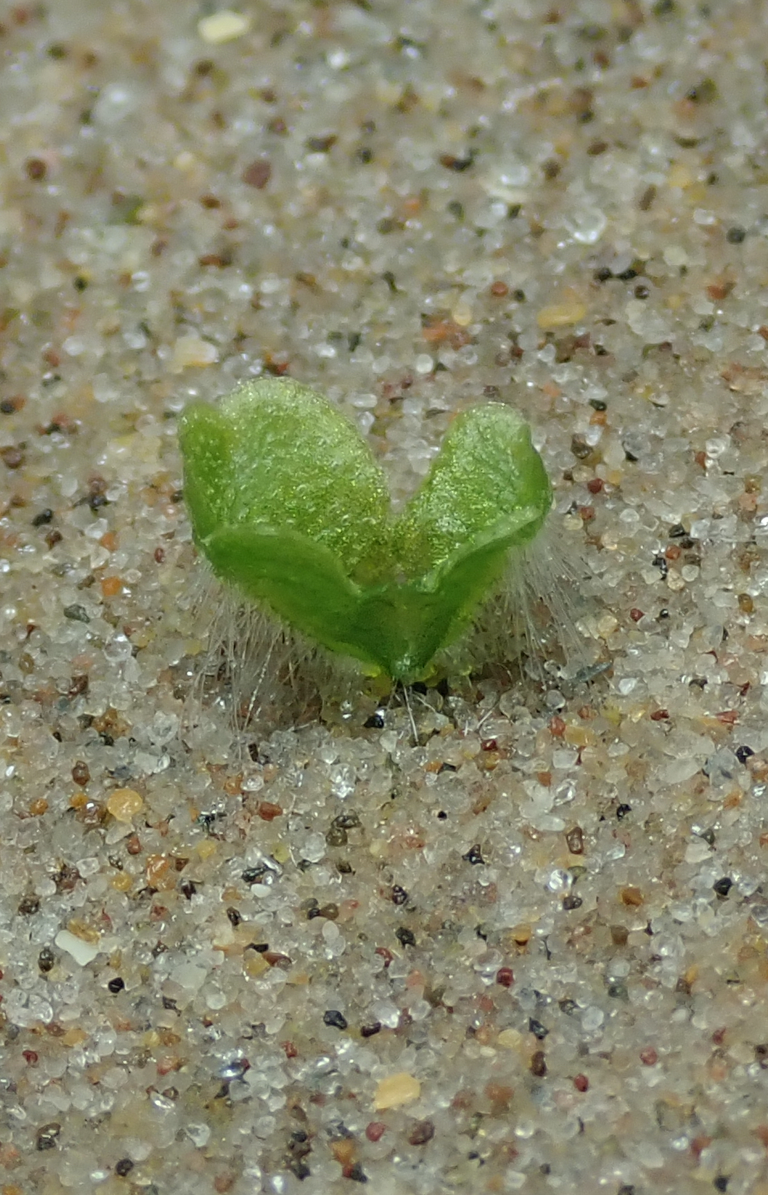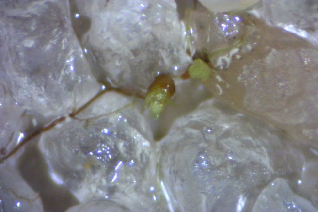 After one more week, I got tired of my boring experiment and I transferred the three remaining bulbils onto sand, which I had washed and boiled to remove contaminations. Transferring the third bulbil, I realised it was connected to the substrate by several thin threads, which I had not noticed before. So something had grown, I just could not see it. Too late – they all had to move onto sand. I am very happy did this. The lighter colour of the sand makes observations much easier. After about a week, green protonema (chloronema) had developed.