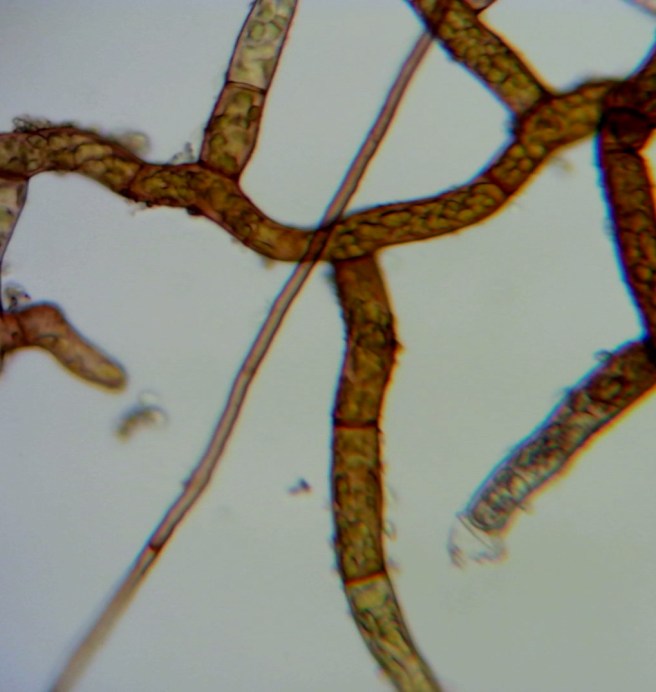 The first species I had a go at was Bryum dichotomum, which I had found on a tarmac pavement. B. dichotomum is actually a species complex, and I am not exactly sure which species I picked. Like all species of the complex, my sample carried specialised vegetative dispersal units – bulbils. There is a photo below showing these bulbils under a dissecting microscope. Comparing to Smith’s flora, I would say they look like B. dichotomum s. str.