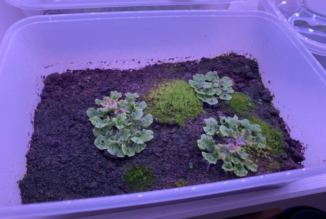 Using ceramic pots was a cute way of cultivating bryophytes and may be a good way of making bryo gifts, but I found that the pots’ high rims make manipulations cumbersome. Because the rims are not transparent, they also cut out light, which bryophytes might otherwise use to grow, and they can cause shading under a dissection microscope. I have thus moved to using larger transparent containers: takeaway boxes. They are durable, they can be cleaned in a dishwasher between experiments, and they were available even during the Scottish lockdown.