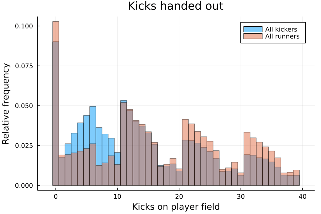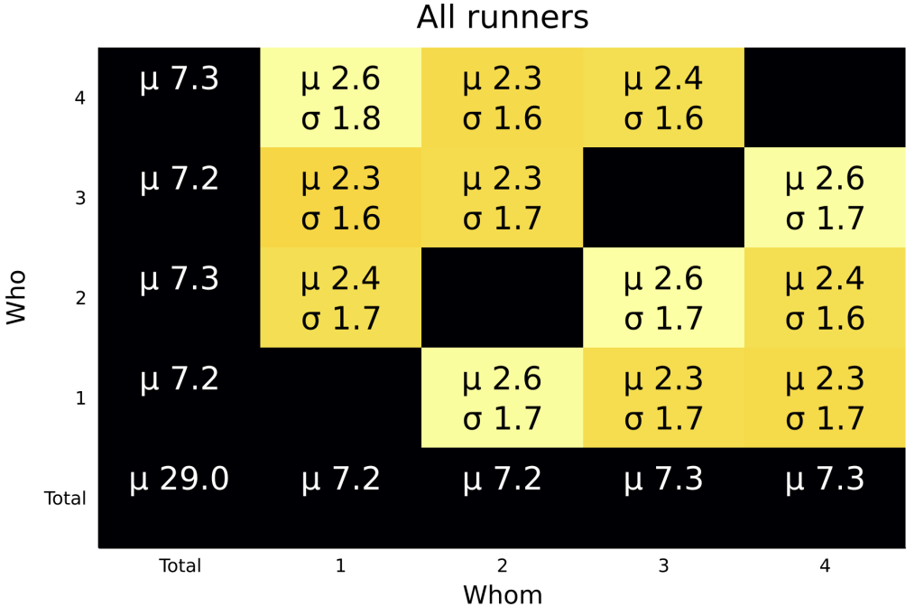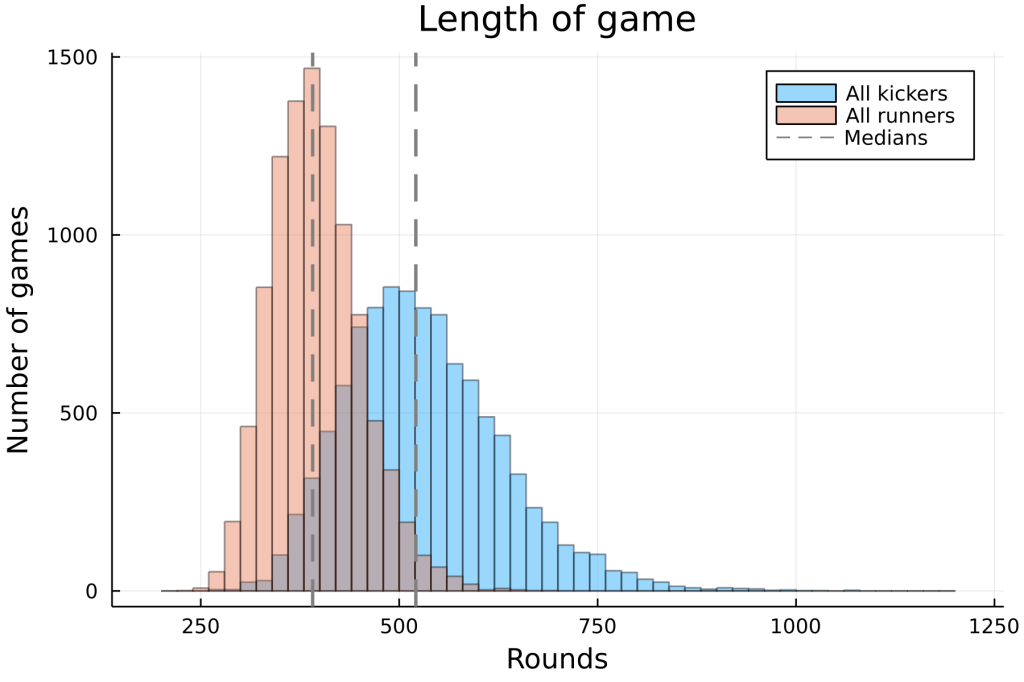 The black plot margins have the column and row sums, showing for each payer how often, on average, they kick (rows) or are kicked (columns). The bottom-left cell gives the average total kicks per game. Unsurprisingly, these averages are higher for all-kicker games than for all-runner ones. Also, the number of kicks passed is equal to the number of kicks received. It might be interesting to see how this would change if different players had different strategies.